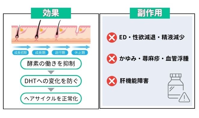副作用はこちらもフィナステリド同様に性機能障害や肝機能障害が報告されており、フィナステリドよりも効き目が強いため、副作用もフィナステリドより確率があがるようです。