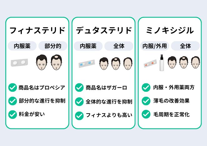 デュタステリドは、フィナステリド同様に2型5αリダクターゼの働きを阻害する作用があり、さらにはフィナステリドでは抑制できなかった1型5αリダクターゼの生成も抑える作用があるため、フィナステリドでは効果が見られなかったという方でも、AGA進行を抑える効果が期待されています。デュタステリド含有のAGA治療薬としてはザガーロが有名です。