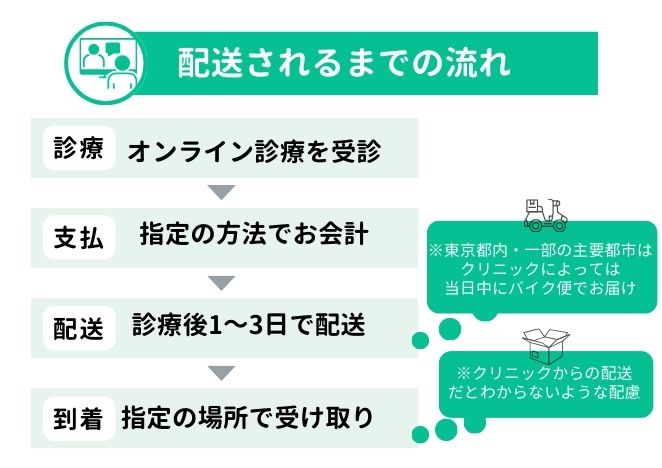 オンライン診察を終えると、処方される薬が決まり同時に決済手続きへ移ります。その際に、お薬の配送手続きもおこないます。クリニックにもよりますが、お薬が手元へ届くまで、一般的に診察を受けてから1日~3日程度の余裕を持っておきましょう。一度に処方されるお薬の量に対し、お薬が無くなる前に再診予約をしなくてはいけませんので、配送までの時間も考えて再診予約を入れることも忘れずに。