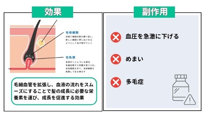 副作用としては、もともと高血圧症の治療薬であったことから関係しており、血圧を急激に下げてしまうという効果が確認されています。この作用のために、厚生労働省では内服薬が認可されていないという経緯があります。