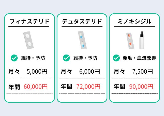 | フィナステリド+内服薬 | 1,851円~/月 | 1,861円~/月 | 2,900円~/月 | 10,800円~/月 |